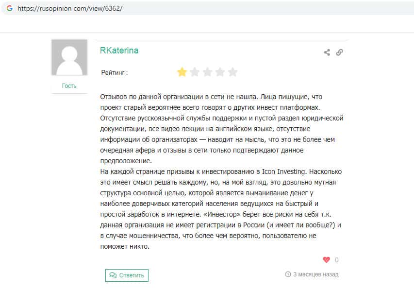 Данный пользователь так же написал отзыв о компании разводил Айкон Инвестинг, предварительно её изучив. Он сообщает, что компания странная, так как по их словам они очень давно существуют, но в интернете нет практически никакой информации о них. Так же он добавляет, что на таких условиях и с такой компанией он бы никогда не стал сотрудничать.