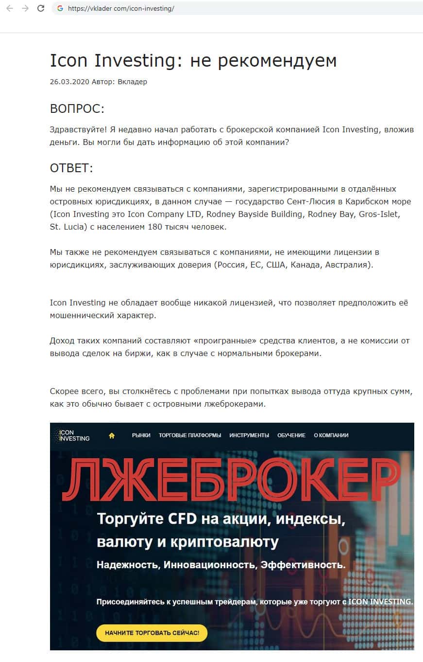 Сайт vklader com так же сделал обзор на компанию разводил Айкон Инвестинг, в котором сказал, что компании не стоит доверять, так как фирма подделывает отзывы о себе, а так же врёт о своём возрасте, что бы пользователи думали, что у мошенников есть огромный опыт в торговле. и это не единственный интернет ресурс, разделивший мнение сайта.