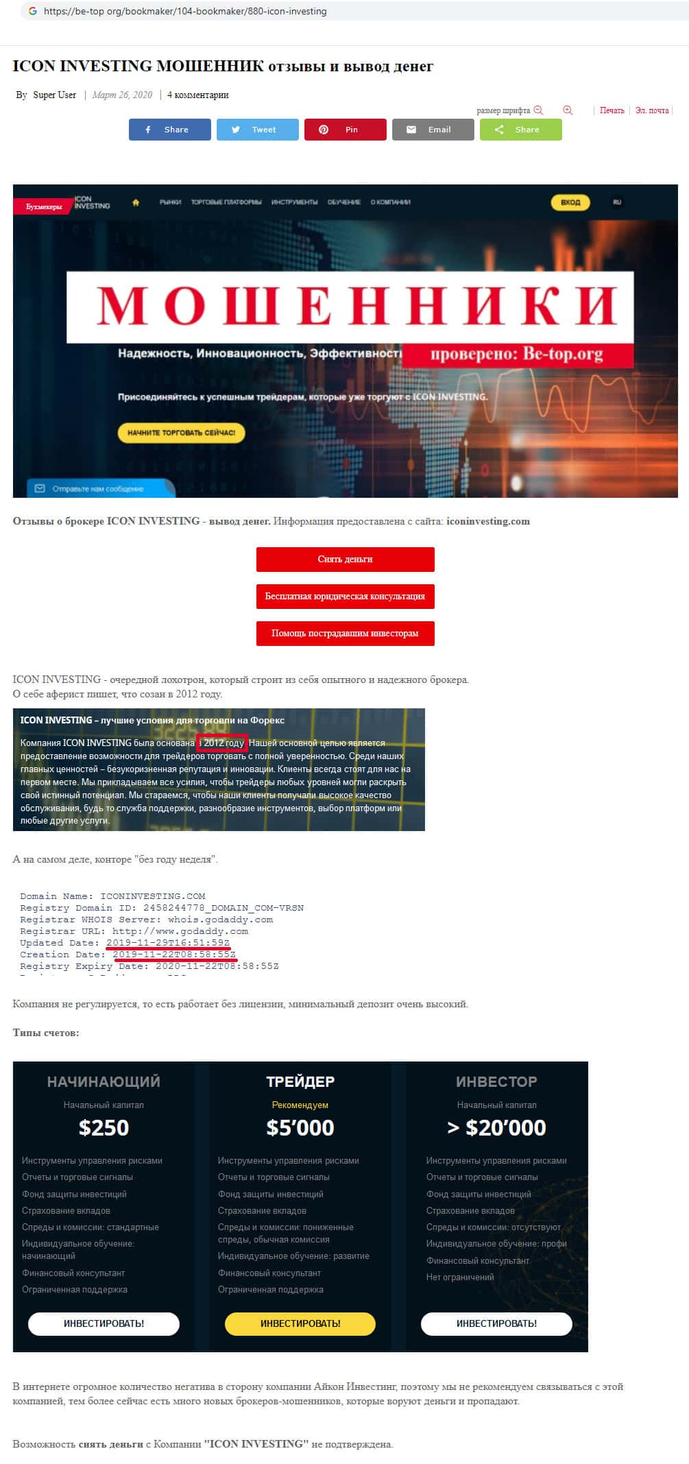 Так же в стороне не остался и сайт be-top org, который назвал компанию Айкон Инвестинг - мошенниками. Он привёл пример того, как компания врёт по поводу своего возраста, а так же сказал то, что нет подтверждённых данных о том, что компания действительно может выводить деньги, ведь они только обещают, но нет никаких доказательств.