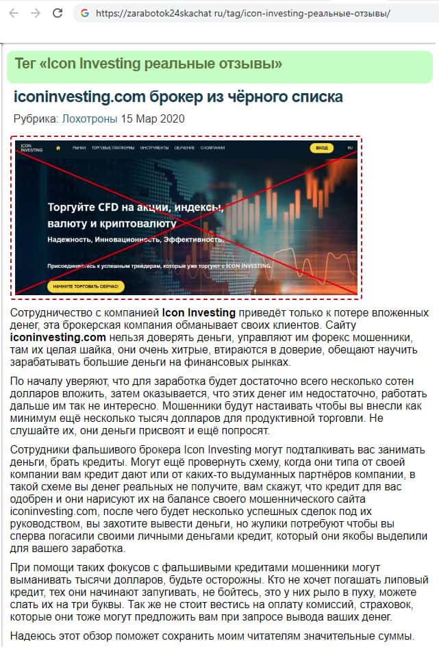 На сайте "заработок24скачать ру" есть информация о том, что данный псевдоброкер находится в чёрном списке. Так же сайт рассказывает о том, как работают мошенники Айкон Инвестинг, они втираются в доверие к пользователю, заставляют регистрироваться, после чего начинают тянуть из него деньги. а если они заканчиваются, то принуждают занять или взять кредит.