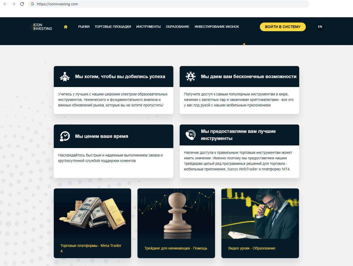 Главный интернет ресурс компании аферистов Айкон Инвестинг представляет собой дешёвый коммерческий проект, главной задачей которого является привлечение неопытных пользователей, которые поведутся на яркую упаковку сайта. Сайт с самого начала наполнен лживой информацией и призывает к инвестированию.