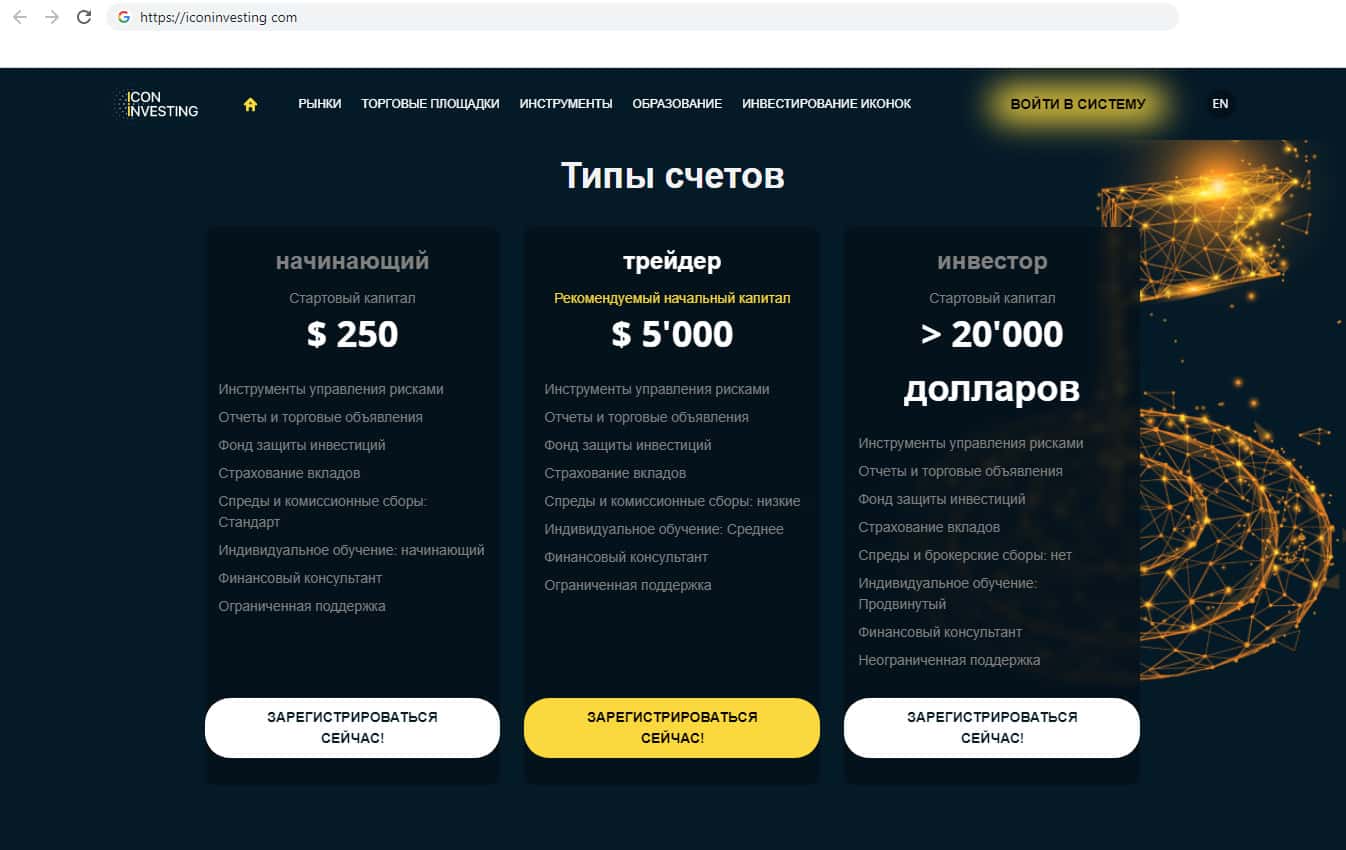 Псевдоброкер IconInvesting для пользователей предоставил выбор, в котором они могут выбрать счёт, который им подходит. Для начинающих минимальный депозит составляет 250 долларов, для более опытного трейдера 5000 долларов, ну а для инвестора более 20000. Все эти суммы огромны, особенно для начинающего трейдера.