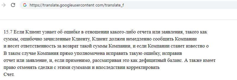 В договоре с компанией кидал есть некоторые возмутительные пункты, такие как этот, в котором говорится о том, что если компания ошибочно перечислит клиенту большую сумм, то он обязуется вернуть её, или же компания отметит все сделки и будет корректировать счёт клиента, то есть у мошенников есть доступ к аккаунту пользователя, и они могут снимать деньги.