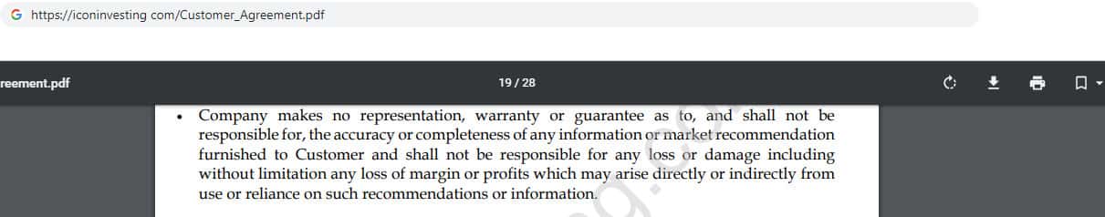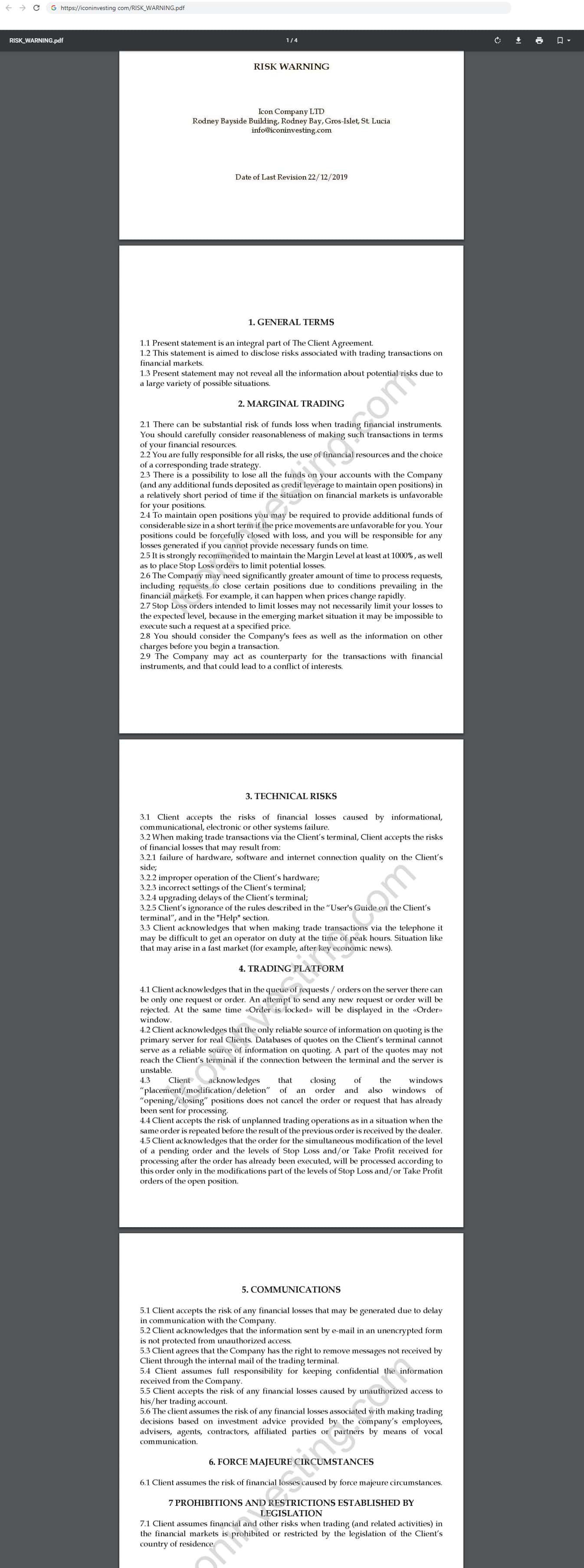 Аферисты Айкон Инвестинг предоставили на своём сайте документ под названием "Предупреждение о риске", в котором снимает с себя всю ответственность, но только опять проблема с переводом, так как данный документ предоставлен только на английском языке, а переводчики не могут перевести этот документ.