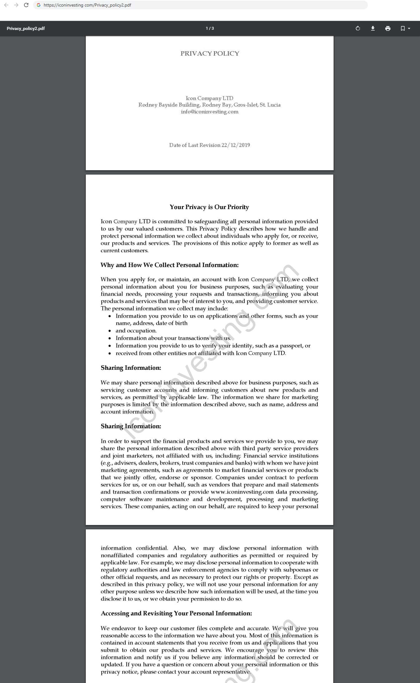 Жулики Айкон Инвестинг предоставили политику конфиденциальности, но вот только она представлена только в англоязычном формате, а переводчики перевести её не могут. Скорее всего там есть пункты, о которых жителям стран СНГ, не владеющими английским языком, знать не нужно, иначе почему не предоставить перевод?