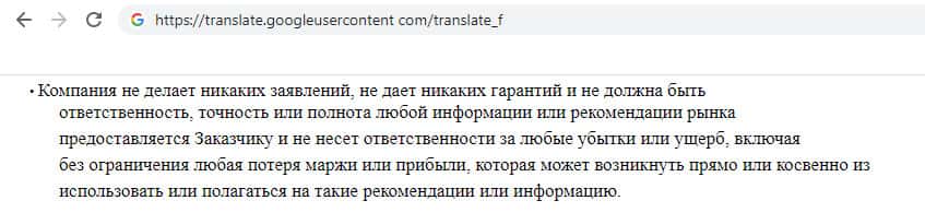 Так же мошенники прямо говорят о том, что не несут ответственность за ту информацию, которую предоставляет компания, а так же клиент несёт ответственность за убытки, которые могут повлечь за собой советы компании. Жулики буквально говорят, что врут клиентам и отказываются от ответственности за это.