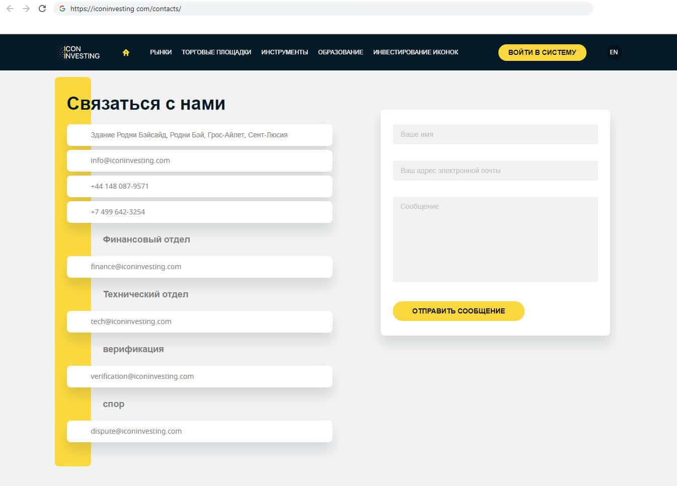 Лохотрон IconInvesting предоставил свои контактные данные, в которых указал довольно много информации, особенно очень много адресов электронной почты, так как у каждого отдела компании своя почта, что очень странно. Указаны 2 номера телефона, один из которых Российский, и это очень странно, ведь даже нет русскоязычной версии сайта. Контакты мошенников:
