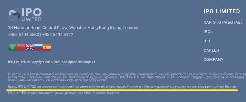 В подвале своего сляпанного сайта проходимцы АйПиО Лимитед указали, что их деятельность контролируется регуляторами Гонконга и почему-то Белиза. Видимо, это два регулятора, о которых вообще знают мошенники