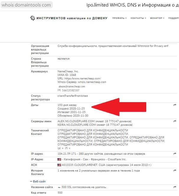 Данные о времени создания домена ipo limited нам удалось найти на сайте whois domaintoois com. Возраст мошеннического домена составляет 153 дня! А значит, вся информация на сайте прохиндеев АйПиО Лимитед о многолетнем опыте работы полный фейк!