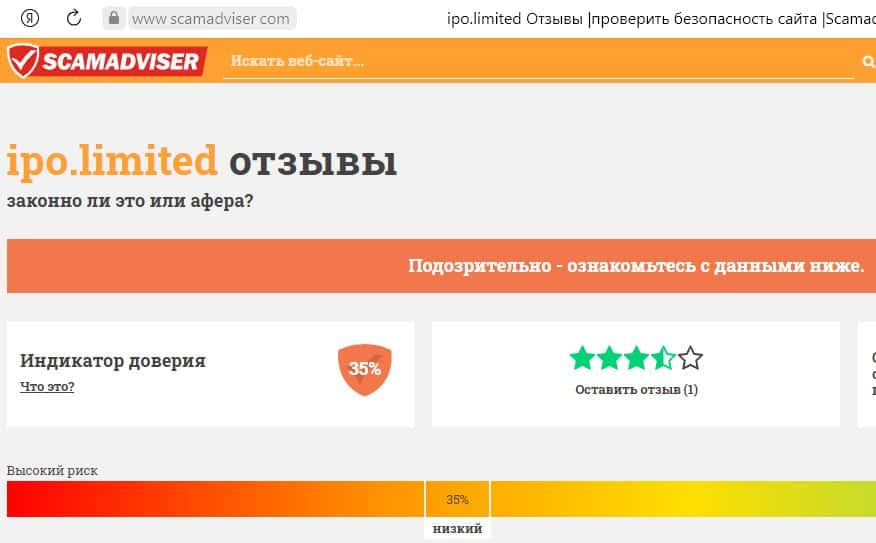 Проверка шулерского сайта ipo limited на сайте Scamadviser показала, что сайт мошенников опасен для использования. У него крайне низкий рейтинг доверия и высокий уровень риска потери денежных средств.
