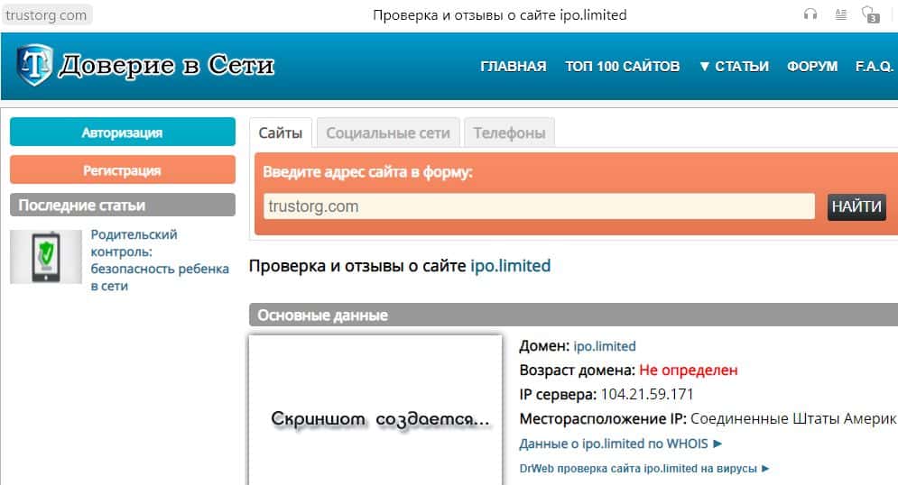 Сайт Доверие в сети не смог определить возраст домена ipo limited. И эту информацию махинаторы АйПиО Лимитед тщательно скрыли.