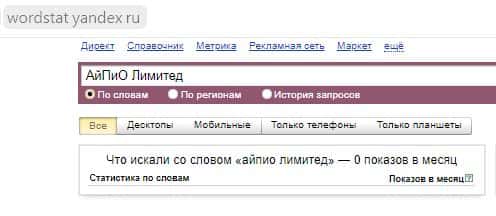 За месяц в Яндекс по бренду "АйПиО Лимитед" не было сделано ни одного поискового запроса.