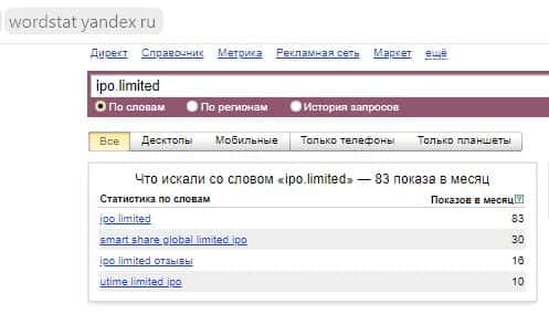 По бренду "IPO Limited" в Яндекс было сделано 83 поисковых запроса, что тоже ничтожно мало для надежной компании, которой можно доверить большие инвестиции.