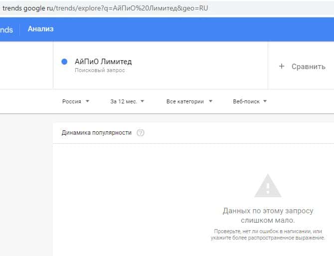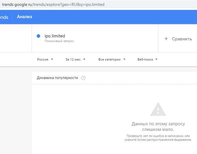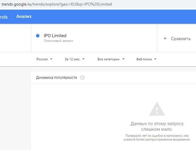 По бренду "IPO Limited" тоже нет данных по запросам. Вероятнее всего, мошенники АйПиО Лимитед не оптимизировали свои данные для поисковой системы Google. А это свидетельствует о том, что они шифруют свою жульническую деятельность.