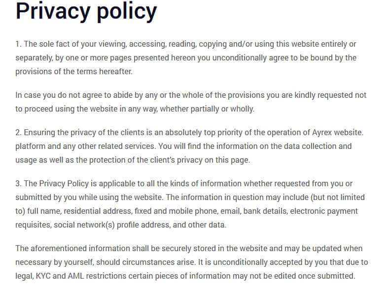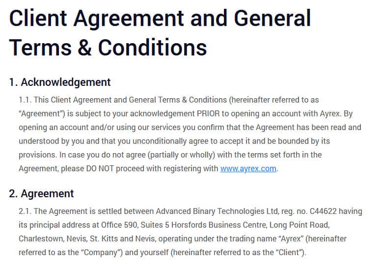 Клиентское соглашение у жуликов Ayrex есть и оно специально составлено на английском языке, чтобы люди не особо в нем разбирались. Скорее всего, авторы и владельцы сего проекта - россияне, это просто такая маскировка. Рассчитывать, что данный договор может дать вам какие-то гарантии не стоит, потому что это мошенническая контора.