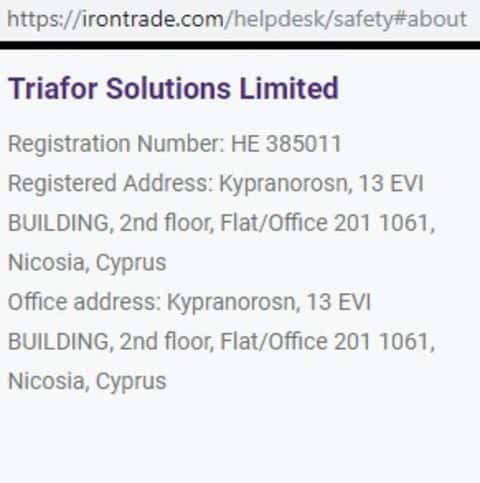 Согласно информации на официальном сайте компании Айрон Трейд, контора выступает во владении конторы под названием Triafor Solutions Limited и имеет такие данные о регистрации и расположения главного офиса: