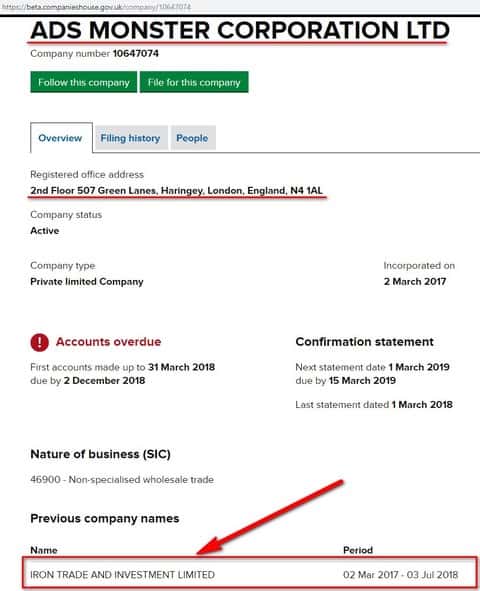 Как выяснилось контора Iron Trade and Investment Limited была основана в 2017 году, а уже в июле 2018 года была перерегистрирована в компанию под названием ADS Monster Corporation LTD, которая расположена по адресу: 2nd Floor 507 Green Lanes, Haringey, London, England, N4 1AL. Вот так схему придумали жулики конторы Iron Trade - и не подкопаешься!