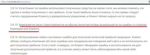 Аферисты дилинговой конторы Iron Trade позаботились о том, что компания не будет нести никакой ответственности по поводу убытков клиента, будь-то он сам виноват, либо к этим убыткам привели действия аналитиков конторы или технические сбои в системе конторы. В любом случае жулье "белое и пушистое".