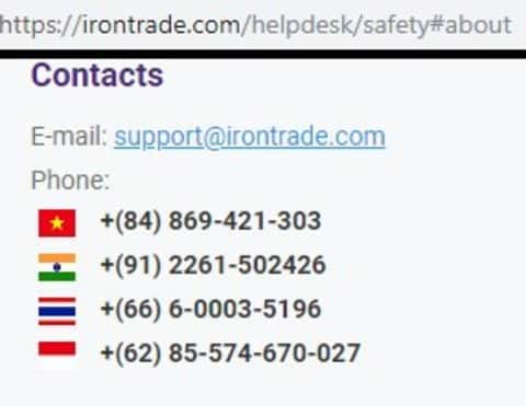 Если рассмотреть официальный сайт конторы Айрон Трейд, то можно заметить, что он мультиязычный и имеет контактные телефоны нескольких стран. Если вам позвонили из одного из нижеуказанного номера, то немедленно бросайте трубку и ставьте в черный список. А вот соответственно и сами номера телефонов: