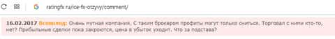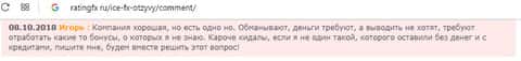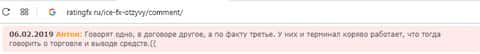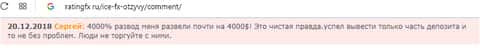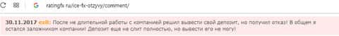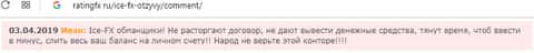 Очередной клиент жалуется на действия лохотрона Ice-FX, так как его развели на сумму порядка 4000 долларов. Человек успел вывести только часть депозита, и то это было сделано для приманки. Когда шулера поняли, что денег от человека больше нечего ждать, то сразу же заблокировали доступ к счету.