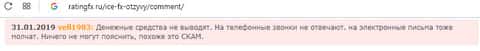 Шулерская кухня Ice-FX в очередной раз показала как она относится к своим клиентам и за счет чего она зарабатывает. Как пример, автор отзыва рассказал как он попробовал вывести свой депозит, но по непонятным причинам он получил отказ. Депозит еще не слит полностью, но никто не отвечает на его запросы.