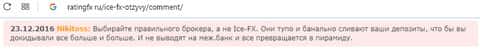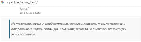 По словам следующего человека, который на себе проверил всю тяжесть работы с конторой Айс ФХ, данный лохотрон не выводит денежные средства своим клиентам, не отвечают на телефонные звонки и по поводу тех же не выводов толком ничего не могут объяснить. Он не рекомендует связываться с кухней Ice-FX.