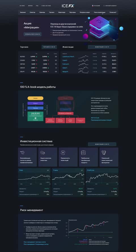 Сайт мошеннической конторы Ice-FX сделан в довольно навязчивом стиле, так как всюду они расхваливают свои сервисы и заставляют вложить деньги как можно скорее. Но, поспешив, скорее всего все знают, чем это заканчивается. Какие-бы они слова там не писали - это все обман.