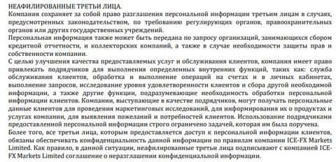 Разглашение личных данных клиентов - один из камней преткновения в отношениях между лохотроном Ice-FX и клиентом. Потому что в документе о политике конфиденциальности, контора Айс ФХ указала, что они имеют право разглашать персональную информацию третьим лицам в различных ситуациях.