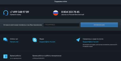 Для связи со своими клиентами контора Ice-FX предоставляет телефоны, скайп, онлайн-чат и электронную почту. Но мы должны предупредить, что не стоит заранее радоваться такой открытости брокеров. Более 95% случаев, после того как вас опрокинут, на связь никто не выйдет ни по одному из каналов. Далее представлена вся информация: