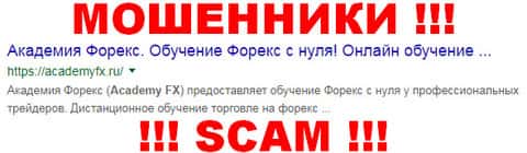 АкадемиФХ – еще одни наглые мошенники на Форекс. Данные жулики, в отличие от собратьев, используют более сложную схему, они позиционируют себя как контору, обучающую тренингу. Можно долго спорить на счёт цен вебинаров и тренингов и их информативности. Факт мошенничества наблюдается в другом, хоть сами шулера AcademyFX людей не разводят, перекидывают доверившихся им клиентов уже на реальные конторы-лохотроны, где люди вскоре теряют все деньги, и позже присылают нам десятки жалоб и просьб помочь в возврате средств. Шарашкина контора АкадемиФХ – прямой пособник многих Интернет-мошенников, и взаимодействие с ней грозит вам потерей всех вложенных средств, в чём в подробностях вы убедитесь ниже. Ни в коем случае не доверяйте наглым мошенникам AcademyFX!
