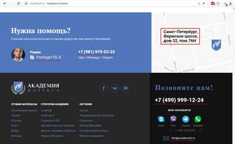 Теперь, контакты. Данные левой конторы, за спиной которой пытаются укрываться жулики АкадемиФХ, мы брать не будет. Также не будем брать на веру личности всех этих опытных тренеров, которые сплошь и рядом торгуют по 10 лет на Форекс, но не могут погладить пиджак. Не убедительная ложь. Откинув всё это, мы получим несколько номеров телефонов, электронный адрес и адрес офиса, в котором, возможно, сидят собственно ушлые звонари и псевдо трейдеры. Вот эти контакты: