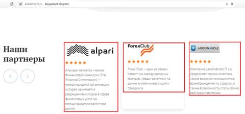 Теперь непосредственно к связи конторы АкадемиФХ с мошенническими конторами. Это именно те конторы, на которые аферисты AcademyFX перекидывают уже доверившихся им клиентов. Их связь можно проследить на самом сайте АкадемиФХ, где в одном из разделов аферисты указали своих "партнеров" – Alpari, Forex Club, Larson&Holz. Об этих мошенниках есть как статья на нашем веб-ресурсе, так и на многих других по всей Сети. Именно они повинны в огромном количестве разводов честных людей на деньги и именно с ними контора АкадемиФХ имеет прямую связь.