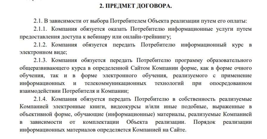В разделе 2 договора компании Академия Альпари идет речь о том, что предметом соглашения служит предоставление информационных услуг пользователю.