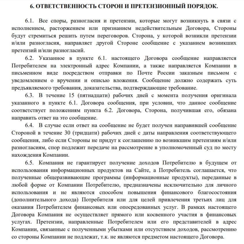 В шестом разделе своего договора инвестиционная школа Академия Альпари описывает порядок разрешения споров и предоставления претензий.