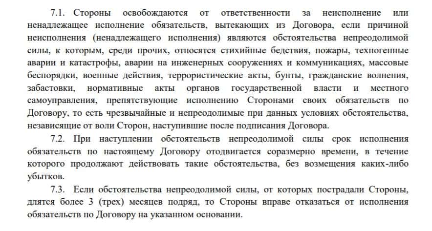 Раздел 7 уведомляет клиента, что в случае наступления обстоятельств непреодолимой силы обе стороны освобождаются от ответственности.