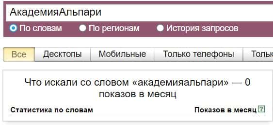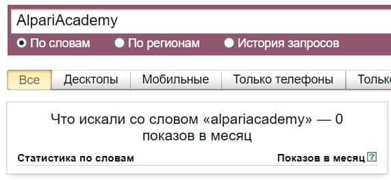 Название бренда на русском языке без пробела "АкадемияАльпари", пользователи не искали в системе Яндекс ни разу.