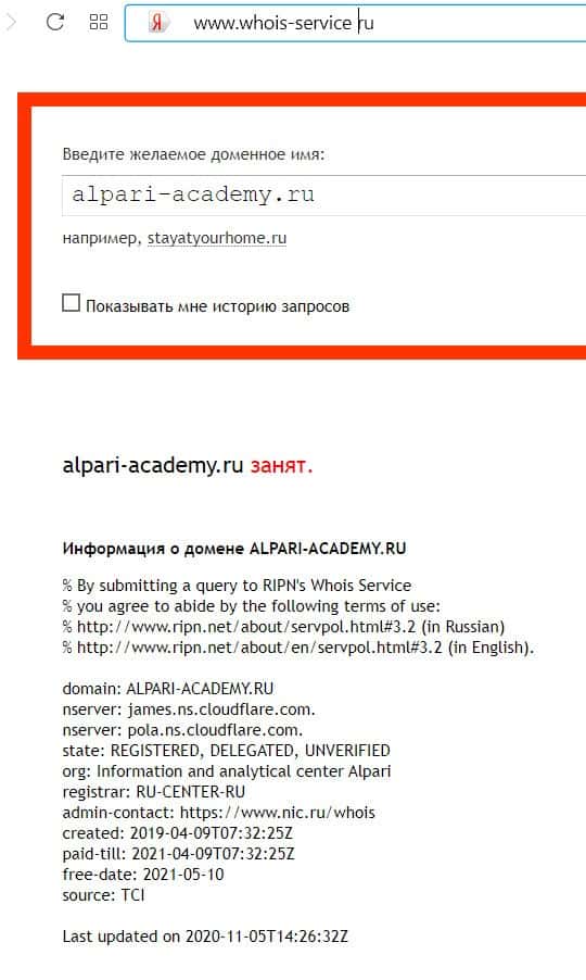 Сервис whois-service ru не показывает информацию о том, кому принадлежит доменное имя alpari-academy ru, так как все данные скрыты. Это признак мошенничества.