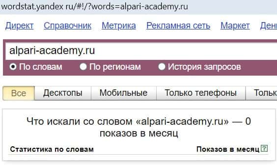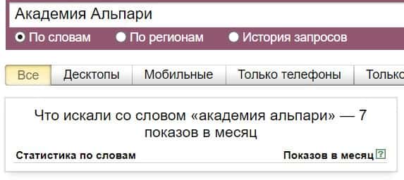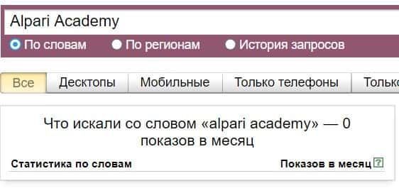 Посмотрим, сколько раз пользователи вбивали в поисковую строку название компании "Alpari Academy"на английском языке с пробелом. Результат такой: 0 показов.