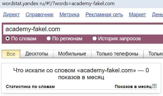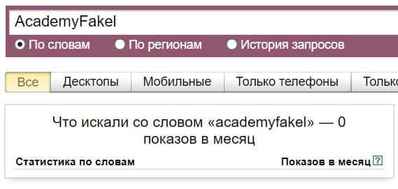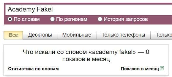 Посмотрим, сколько раз пользователи вбивали в поисковую строку название компании "Academy Fakel"на английском языке с пробелом. Результат такой: ноль показов.