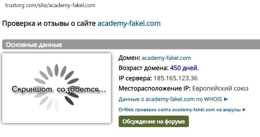 Возраст доменного имени сайта academy-fakel com составляет 450 дней. Если верить данным с сайта Трасторг, то мошенники разводят клиентов на деньги около года.
