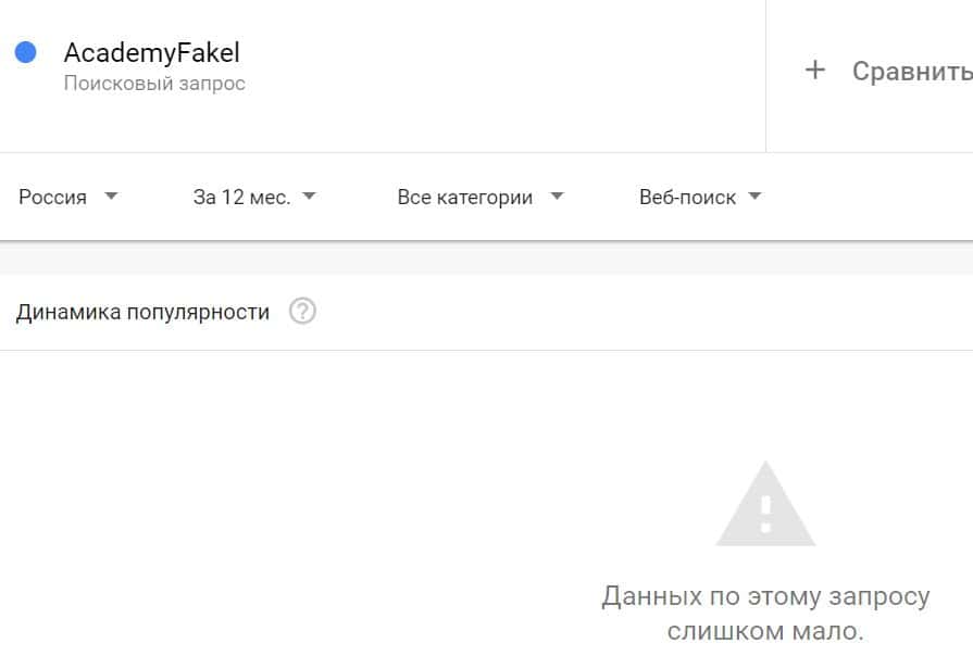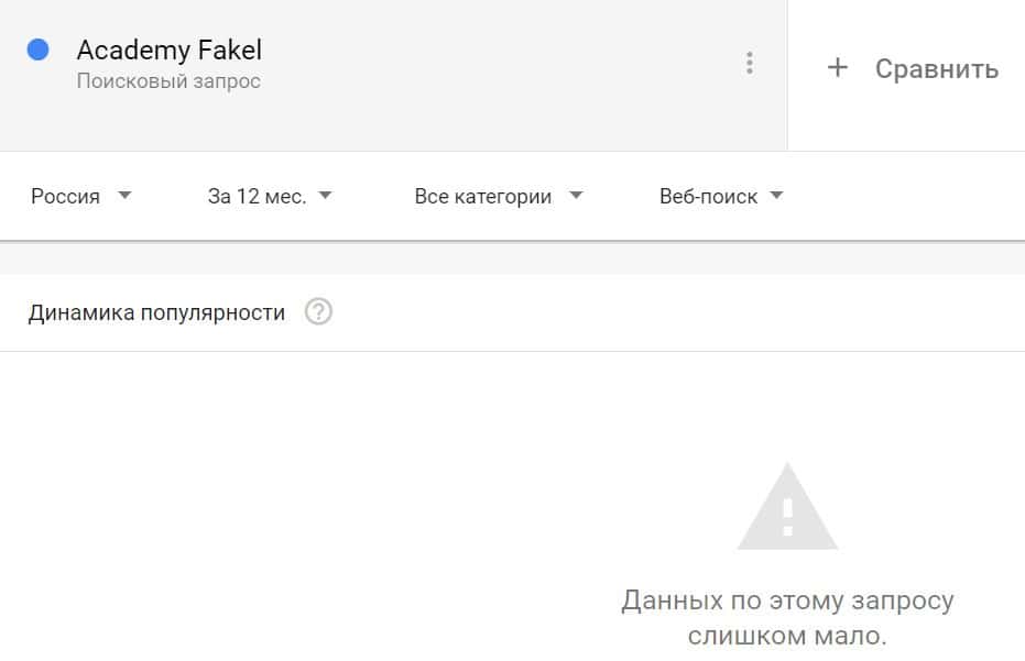 Посмотрим, насколько популярно название бренда "AcademyFakel", написанное на английском языке. Данных по этому запросу нет, так как никто не искал этот бренд в Гугл.