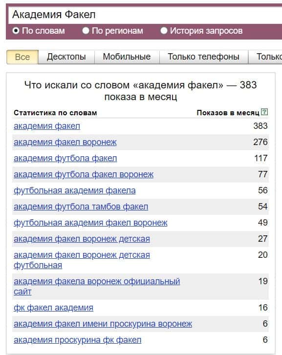 То же название, но написанное с пробелом "Академия Факел" на русском языке, люди пытались найти в системе Яндекс 383 раза.
