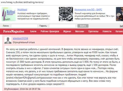 Один клиент рассказал, как он лишился всех денег, так как он посчитал, что лохотрон AkdTrading соскамился и не работает сайт и нет доступа к торговому счету. Скорее всего его айпи заблокировали, из-за этого клиента не пускает на ресурс. К сожалению, жулье Академия Трейдинга и Инвестиций продолжает воровать у людей деньги.