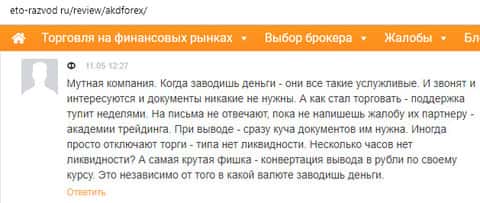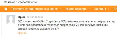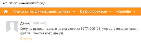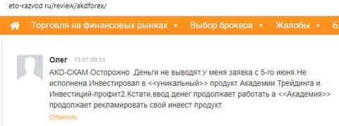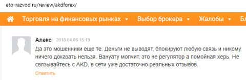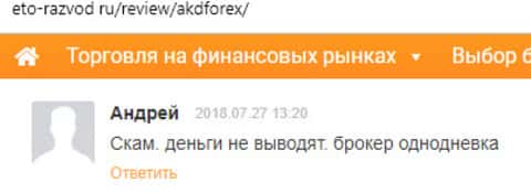 Далее представлен очень короткий отзыв, в котором сразу все становится понятно по поводу деятельности лохотрона AkdTrading. Аферисты создали свою контору, чтобы собрать как можно больше денег с лохов, а потом соскамиться. Так обычно делают брокеры-однодневки, которых очень много стало в интернете.