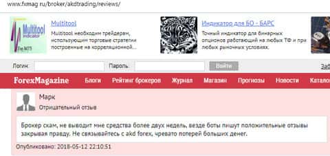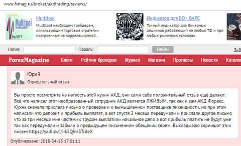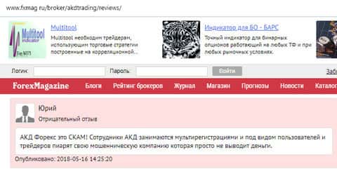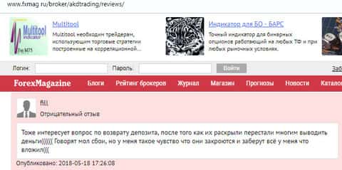 Еще один интернет-портал высказался по поводу конторы AkdTrading, а точнее о торговом роботе, который якобы приносит колоссальные богатства. Жулики используют данное приспособление для того, чтобы привлечь как можно больше лохов. Не связывайтесь с ними, так как есть высокая вероятность потери всех вложений.