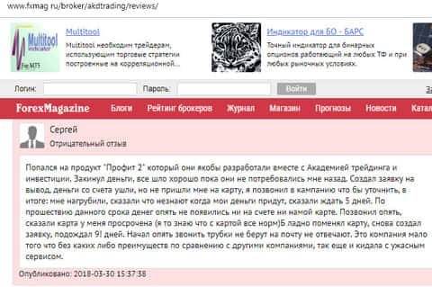 Еще один человек попался на продукт от лохотрона Академия Трейдинга и Инвестиций, который называется "Профит 2". Это очередная кнопка бабло, которая завлекает как можно больше лохов в свою конторку, предлагая огромные заработки от ничегонеделания. Компания AkdTrading - кидалово в чистом виде.