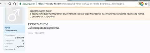 Клиенту, вступившему на форуме в диалог с представителем дилинга АKD Forex, в итоге заблокировали личный кабинет. Представители кухонного брокера АКД Форекс посещают всевозможные форумы с целью обелить собственную репутацию в глазах форекс-общественности. Однако, ничего хорошего из этого, как правило, не выходит. Строптивый трейдер посмел высказать претензию на веб-ресурсе хистори-фх ком. После оглашения им во всеуслышание номера торгового счета, от брокера-афериста АКД Форекс последовала незамедлительная реакция. Торговый счет был ЗАБЛОКИРОВАН!
