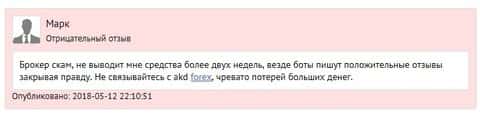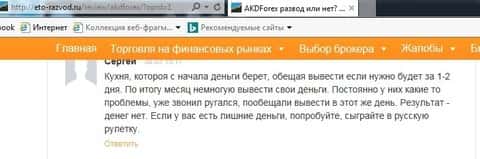 Еще один отзыв в сети о непунктуальности кухонного брокера АKD Forex в части вывода клиентских средств. При пополнении депозита продажник от дилинга АKD Forex почти наверняка красиво обещал, что средства возвращаются трейдеру в течении 1-2х дней, не более. Но мы-то знаем цену этим обещаниям. Автор отзыва Сергей на веб-ресурсе это-развод ру описывает свой печальный опыт изъятия личных денег у кухни АKD Forex.