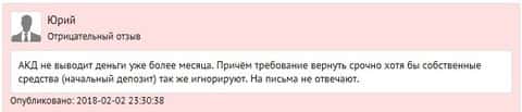 На все том же веб-ресурсе фхмаг ру есть ряд отзывыв от трейдера по имени Юрий, который также попал в очень неприятную ситуацию с дилинговым центром АКД Форекс. Ожидание денег растянулось более, чем на месяц. Причем невозможным оказалось в срок вывести даже собственный депозит, не говоря уже о прибыли. Странное, по меньшей мере, поведение для совсем "свежего" брокера на рынке форекс-услуг.