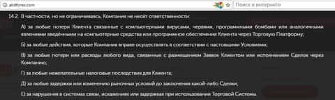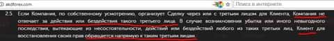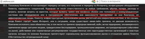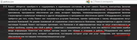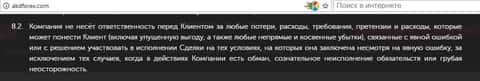 Уже в пункте 2.1 Условий проведения операций (Публичной оферты) клиент дилингового центра АKD Forex столкнется в информацией, что вторая договаривающаяся сторона вообще ни за что ответственность нести не собирается. Даже за самые явные нарушения в ходе заключения сделок!